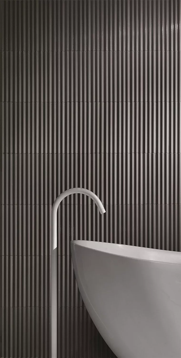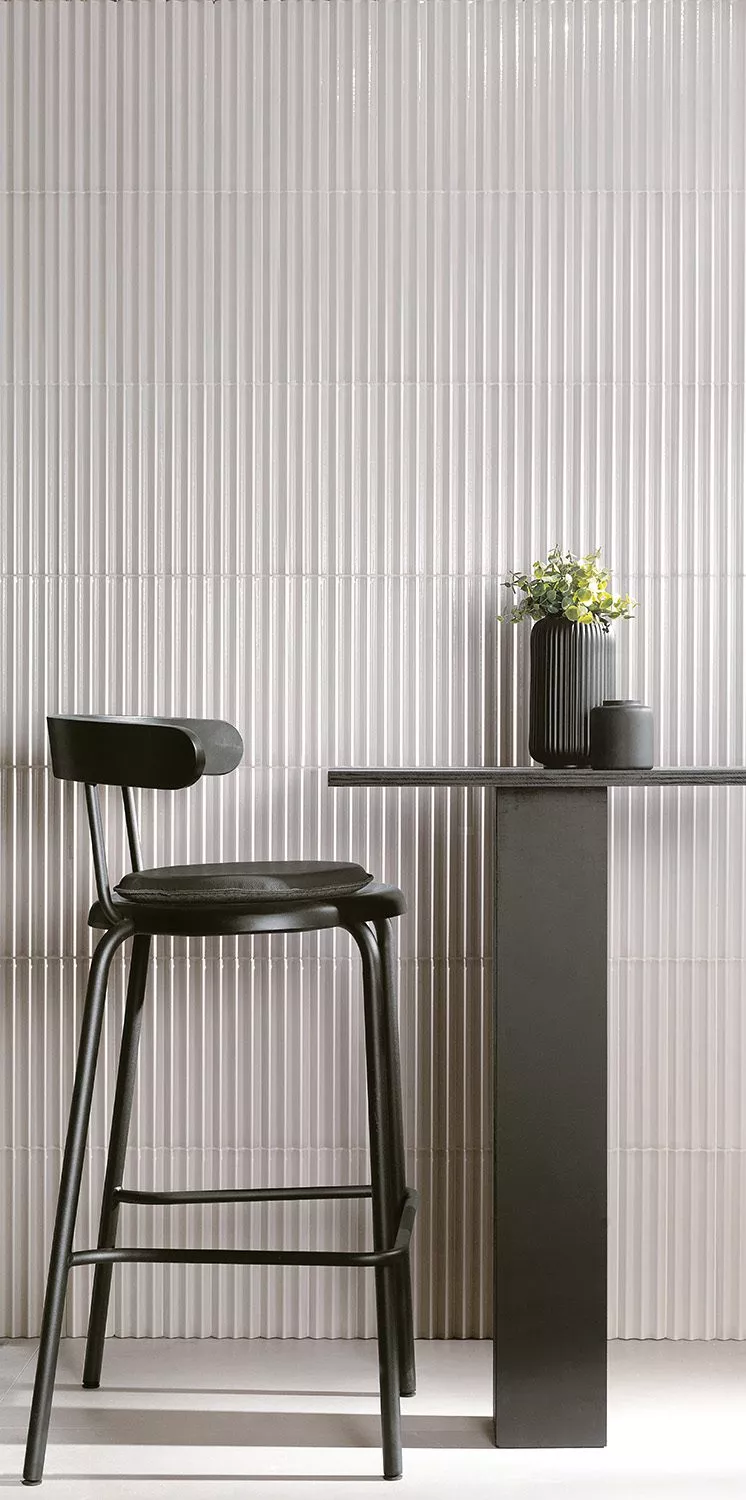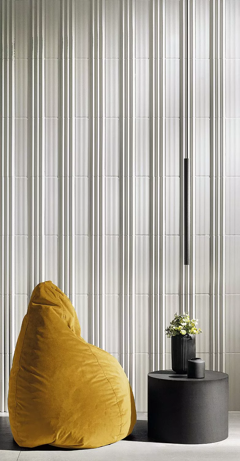 Abacus ceramic wall tile is big on texture! This collection is produced in two different 3D linear tactile surfaces — a bold tuck and crease pleated design and a softer fluted version. The color options are modern and fashion forward. Abacus is sized 3” x 12” and can be applied vertically or horizontally on walls.
